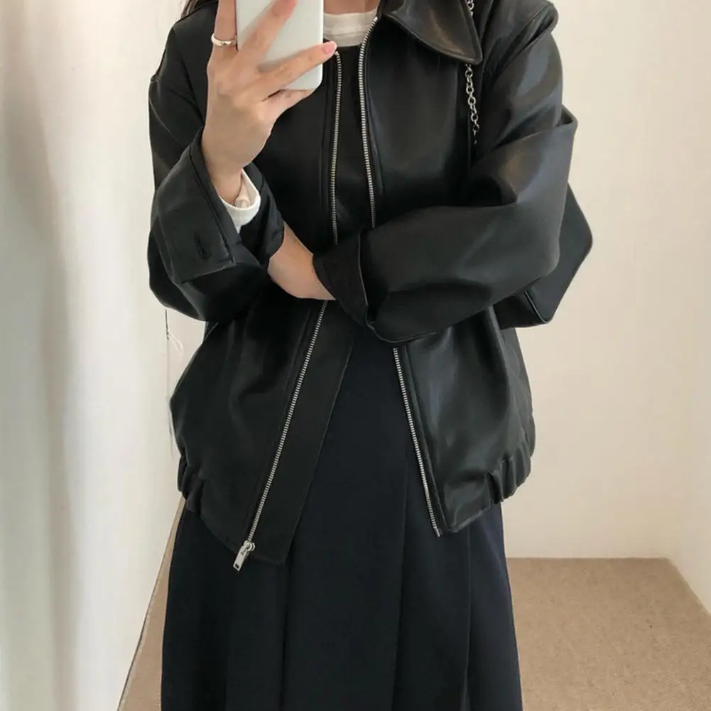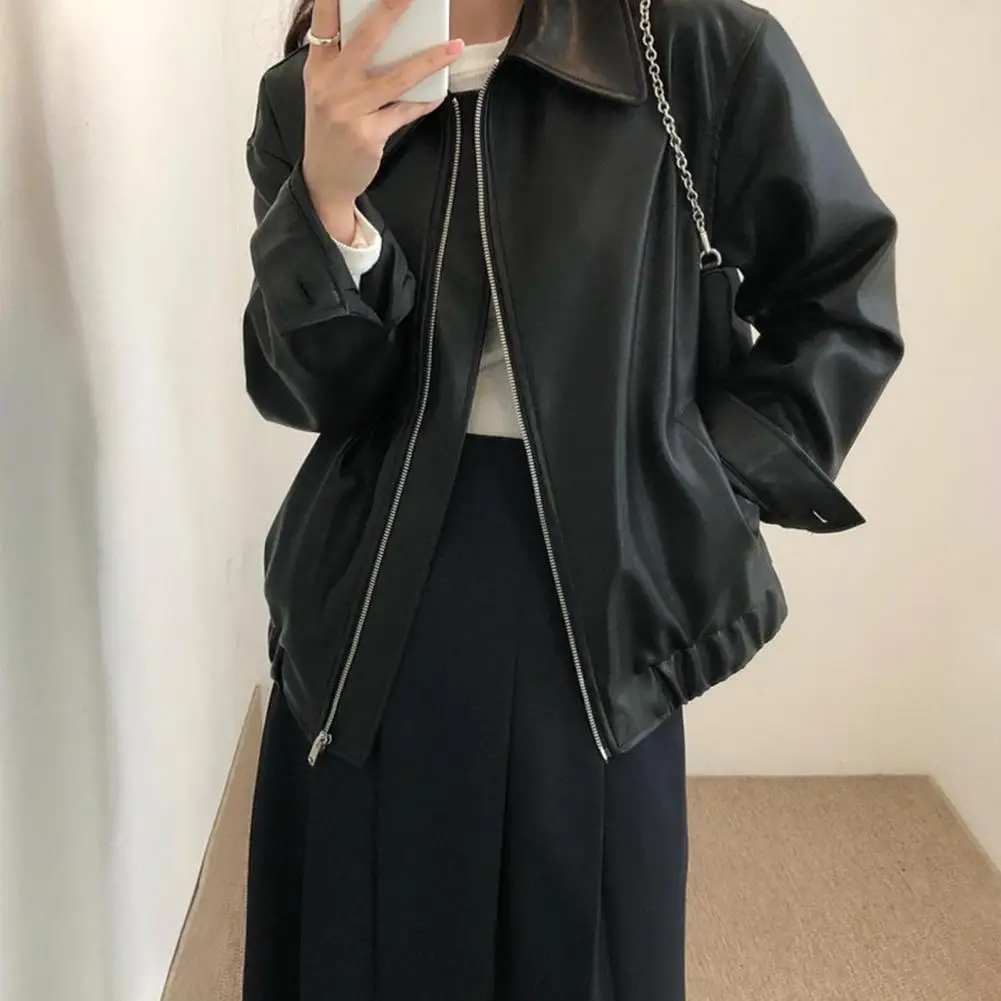 Women Jacket Faux Leather Smooth Surface Turn-down Collar Zipper Closure Stretchy Hem Long Sleeves Motorcycle Coat Travel Outerwear