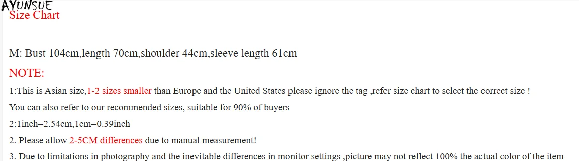 M: Bust 104cm,length 70cm,shoulder 44cm,sleeve length 61cm
