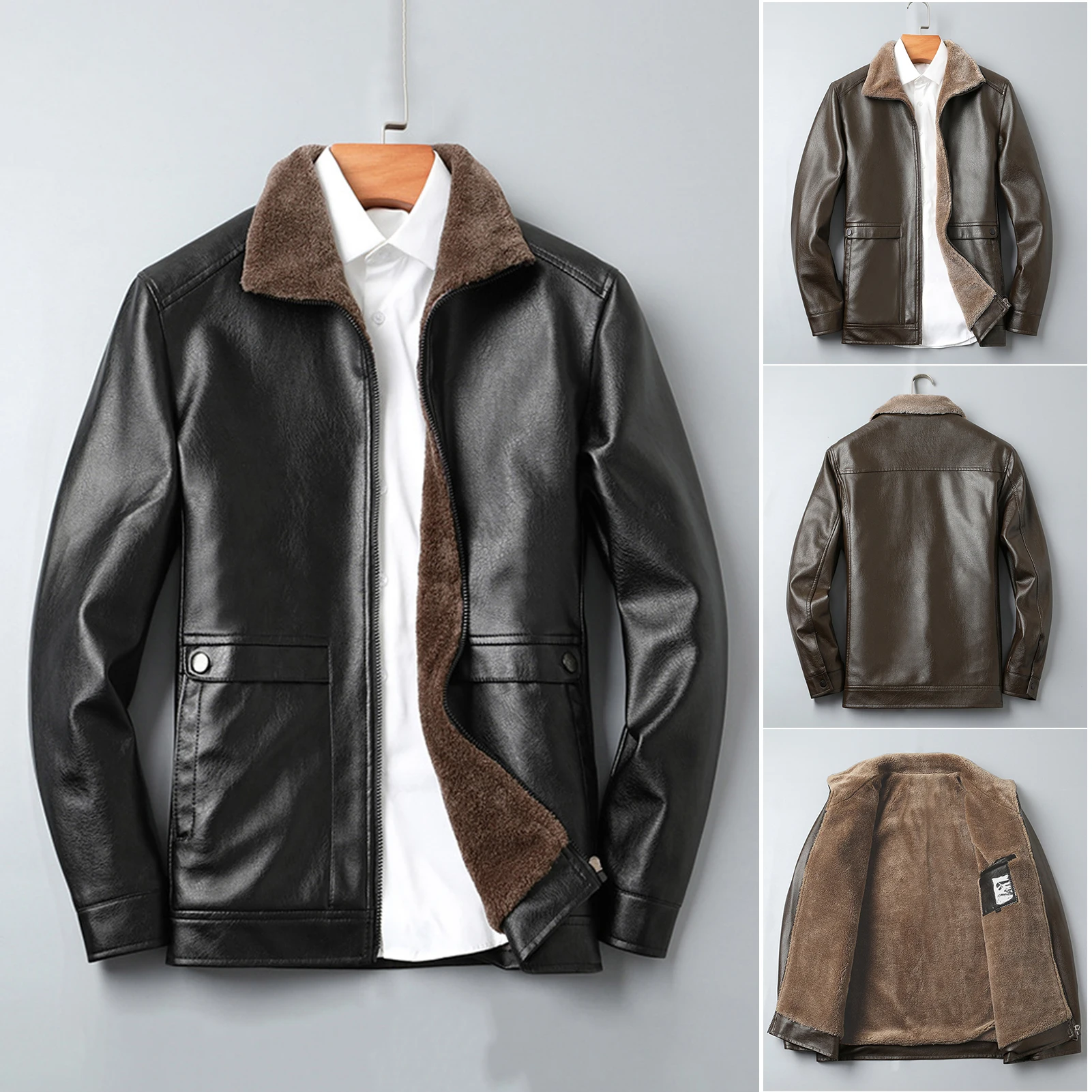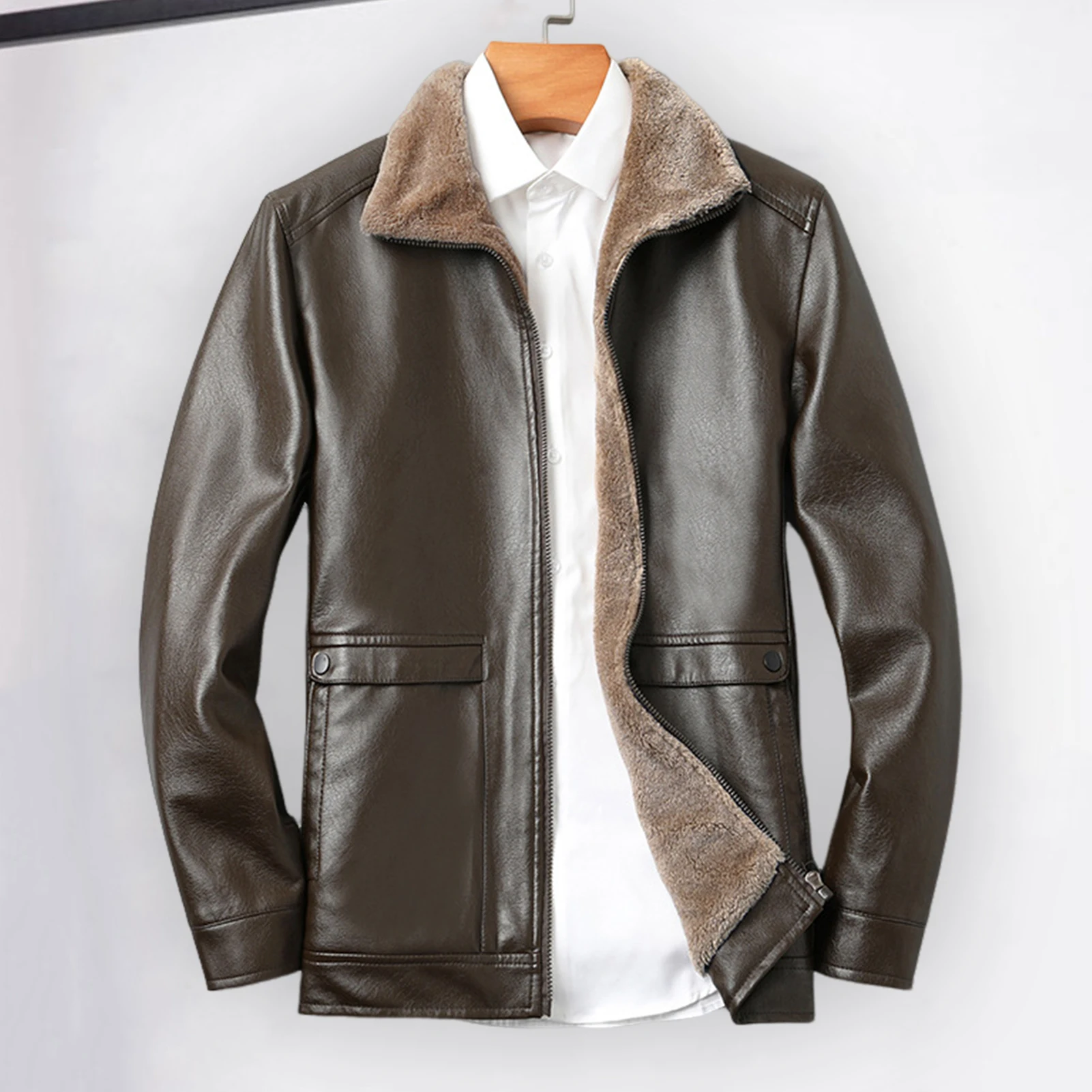 Men Jacket Lapel Long Sleeve Solid Color Faux Leather Jacket with Side Pockets Windproof Plush Lining Biker Outerwear