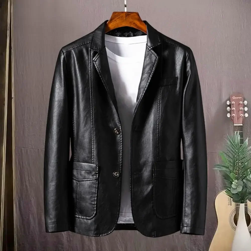 Men Jacket Lapel Long Sleeve Single Breasted Faux Leather Coat with Pockets Loose Fit Solid Color Outwear