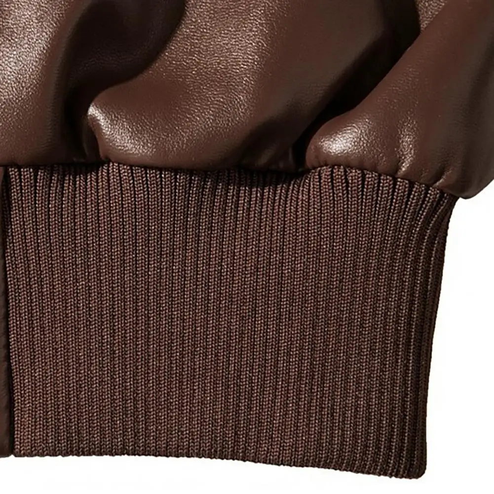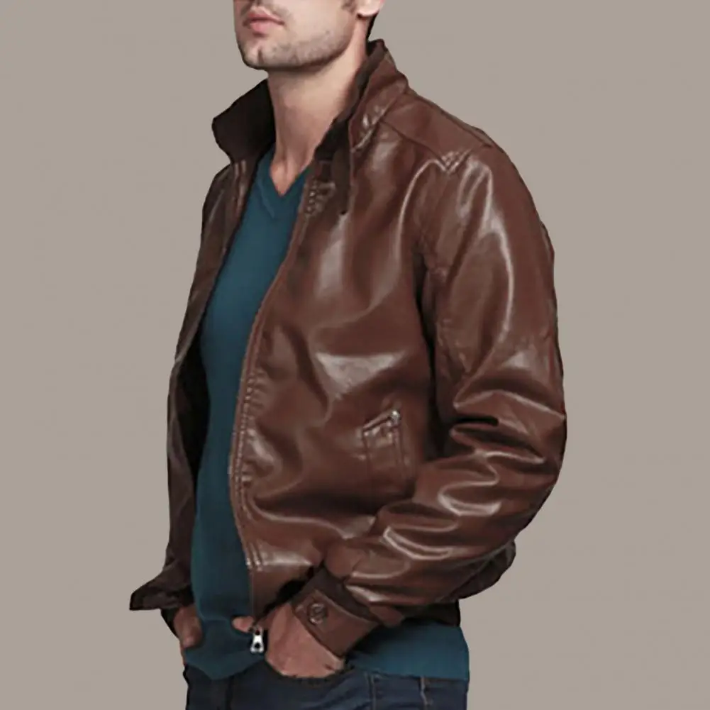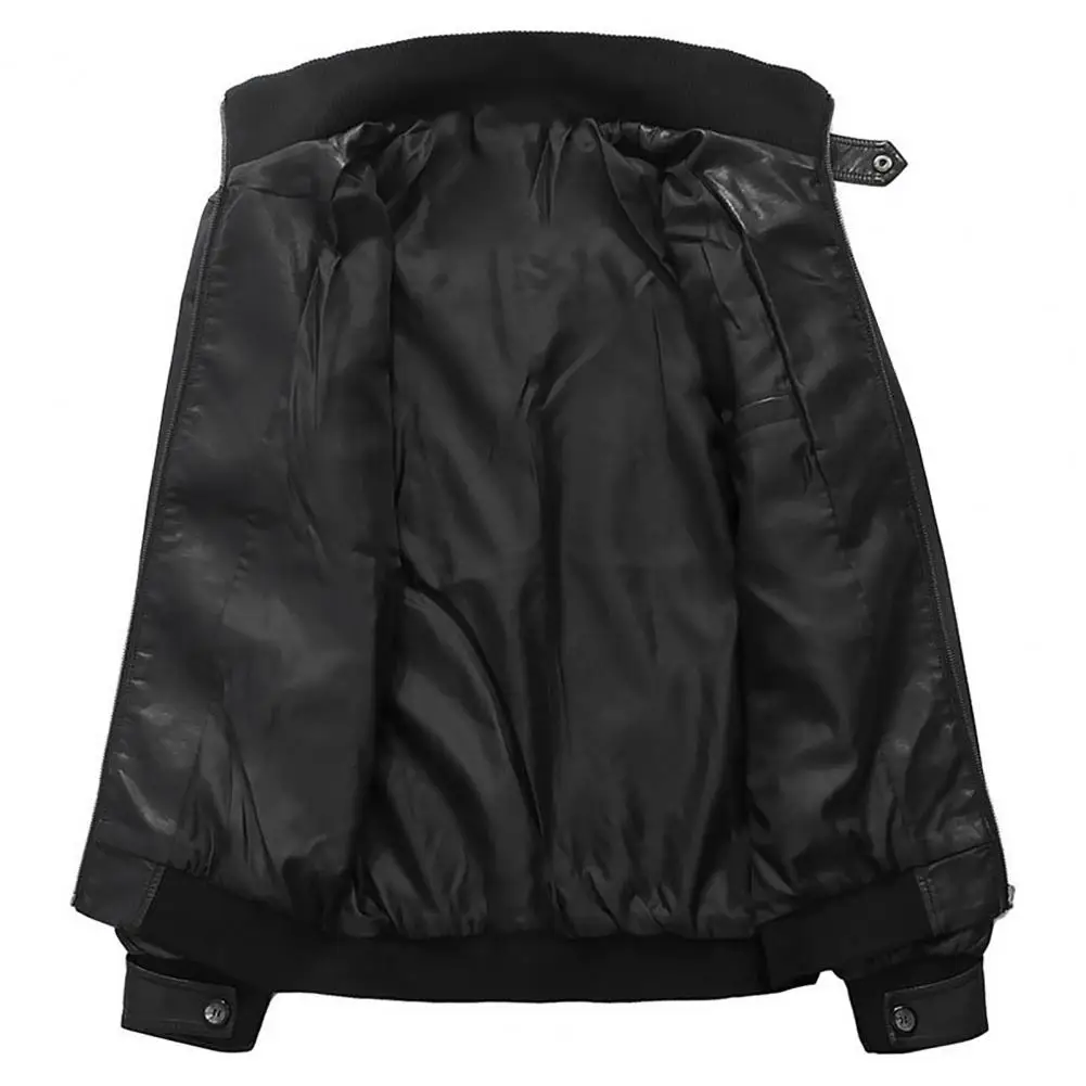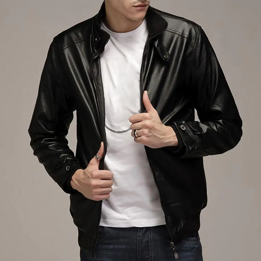 Zipper Closure Stand Collar Men Jacket Faux Leather Solid Color Slim Fit Motorcycle Jacket Outerwear