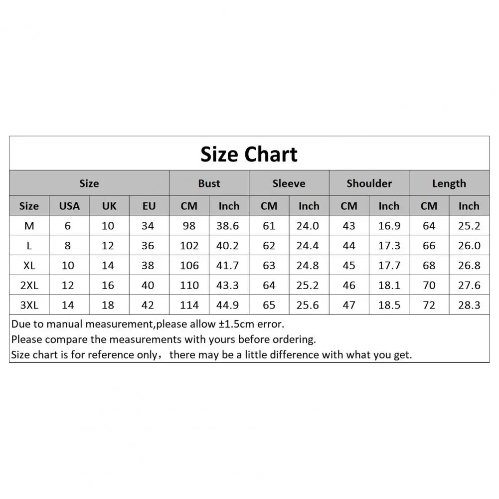 [Our Size 3XL] Shoulder: 47cm/18.5″, Bust: 114cm/44.9″, Length: 72cm/28.3″, Sleeve: 65cm/25.6″ (Approx.)