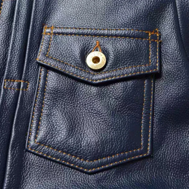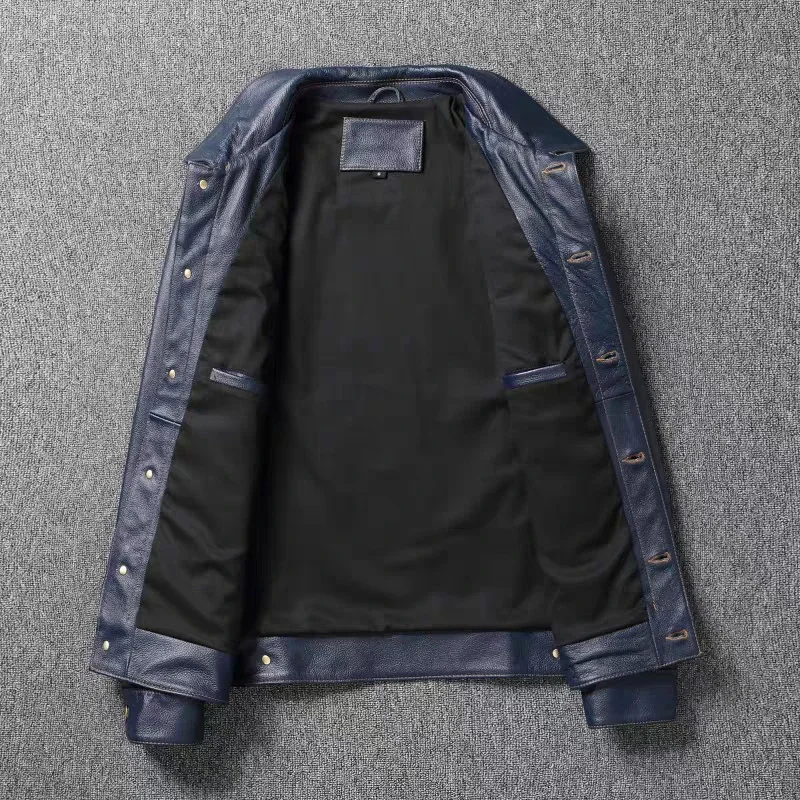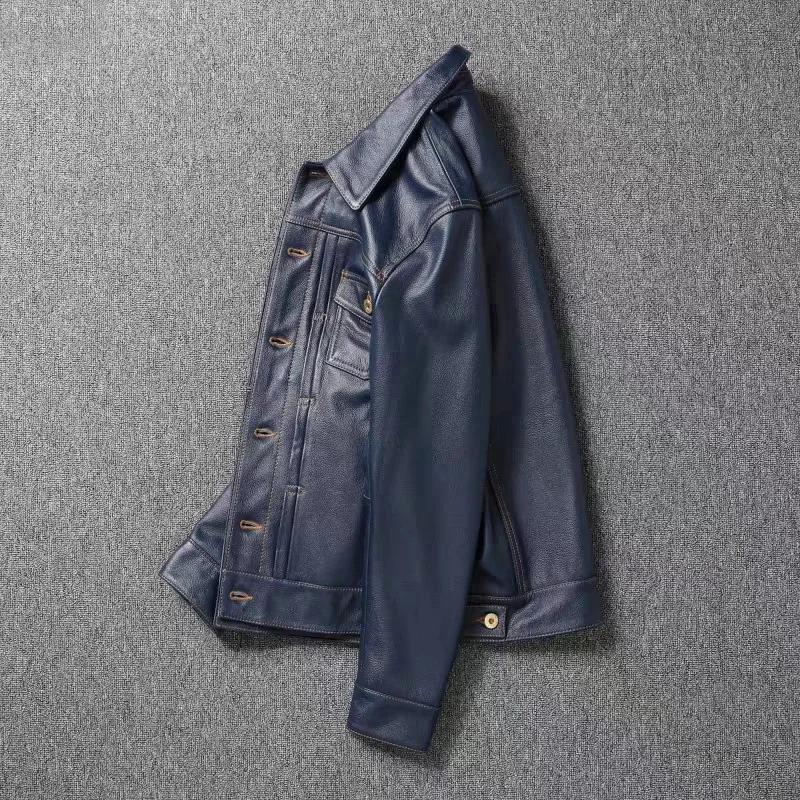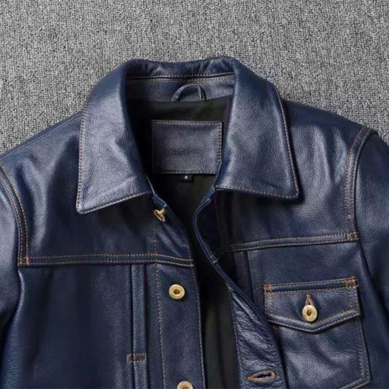 New Navy Blue Top Layer Cowhide Genuine Leather Jacket Men’s Short Slim Fit Retro Motorcycle Lapel Casual Jacket Trendy