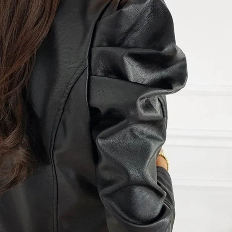 PU Leather Black Jacket Women Autumn Winter Fashin Casual Puff Sleeve O Neck Zipper Cropped Coats Slim Fit Streetwear Blazers