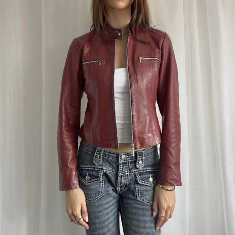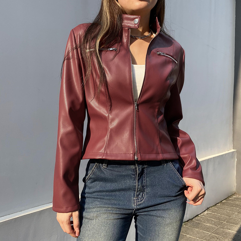 PU Leather Zipper Pocket Slim Fit Slimming Long Sleeves
