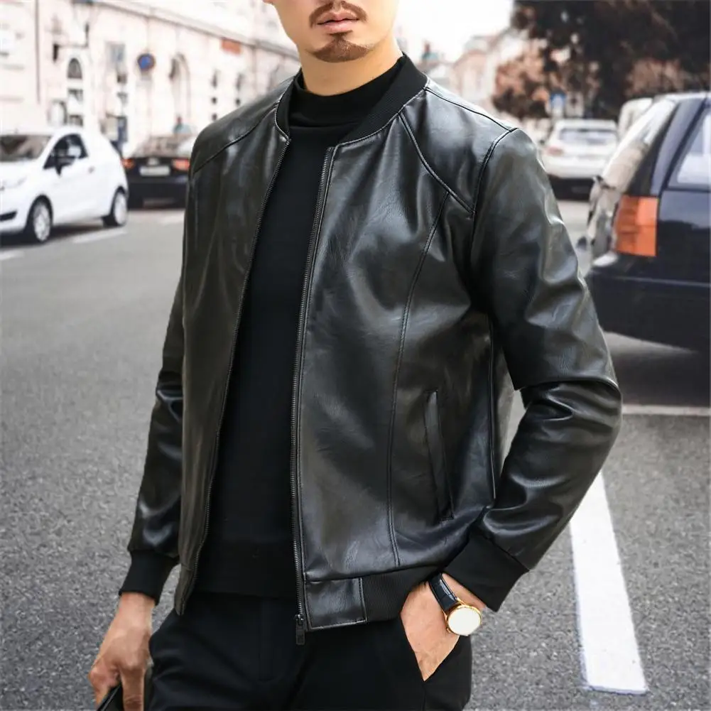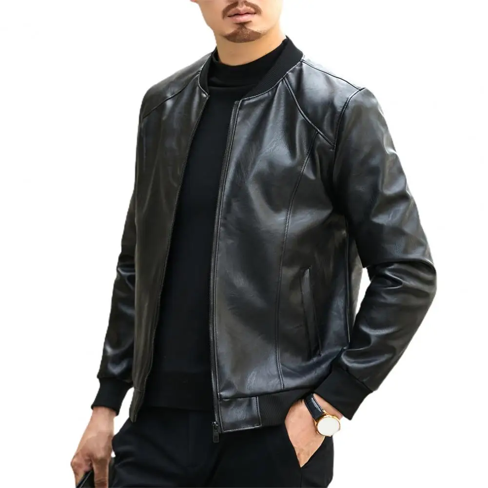 Soft Warm Men Jacket Regular Fit Men Jacket Stylish Men’s Faux Leather Jacket Warm Stand Collar Zipper Pockets for Autumn
