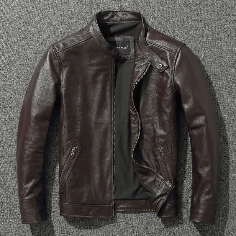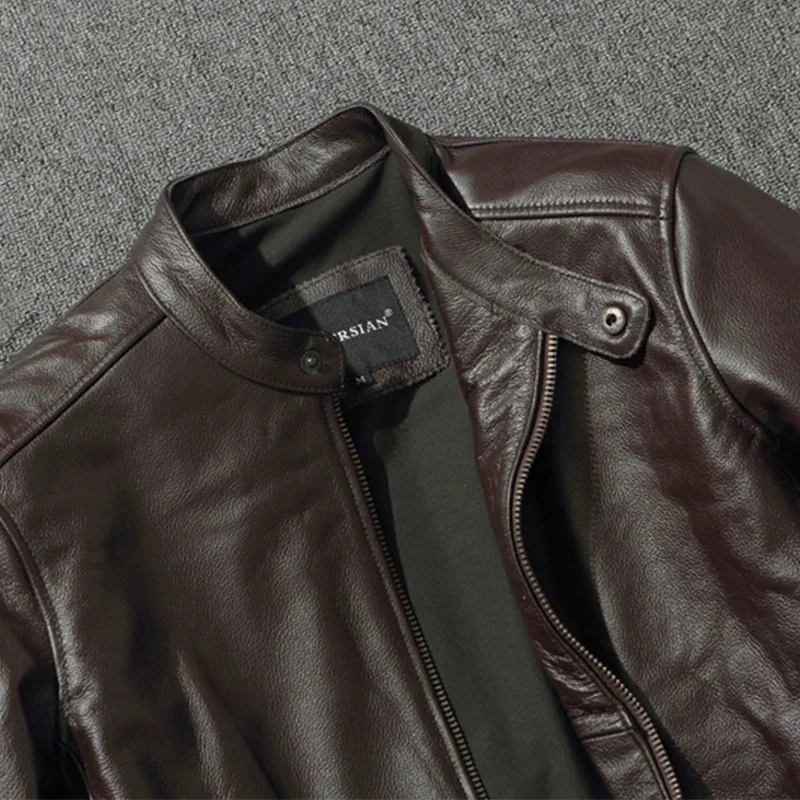 Top Layer Cowhide Jacket Fashion SlimFit Stand Collar Leisure Bomber Jacket 100% Genuine Leather Men’s Vintage Short Zipper M