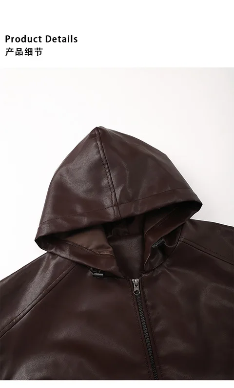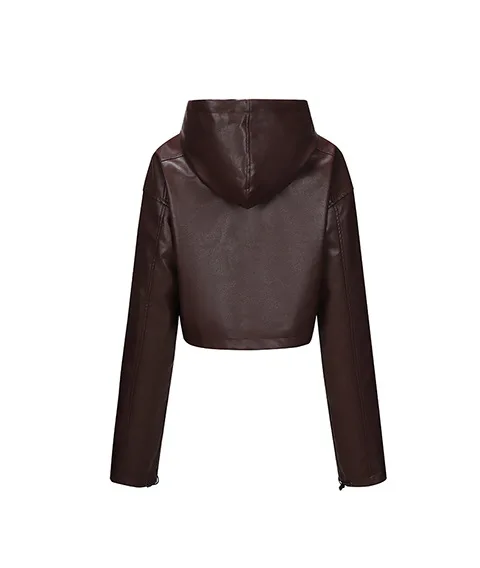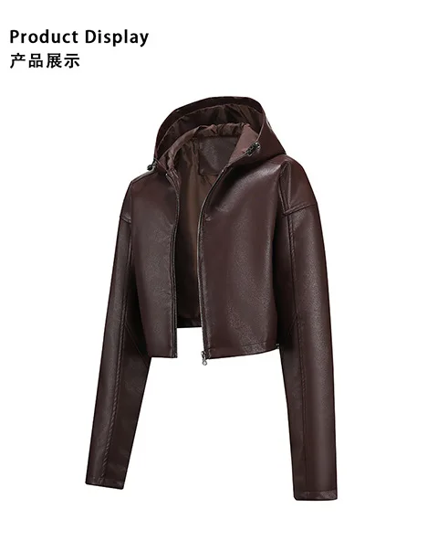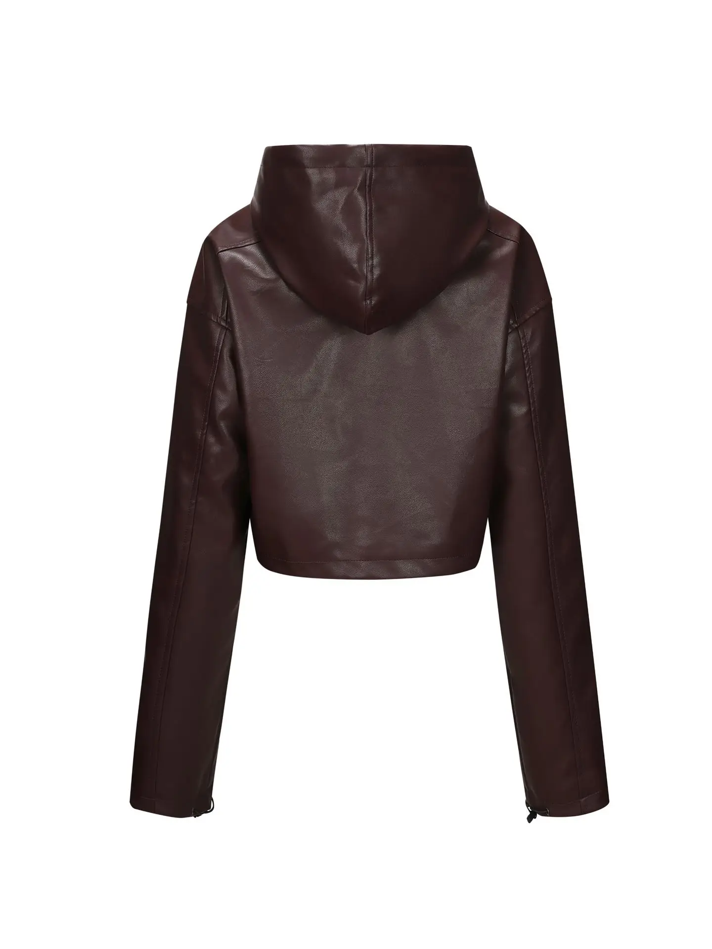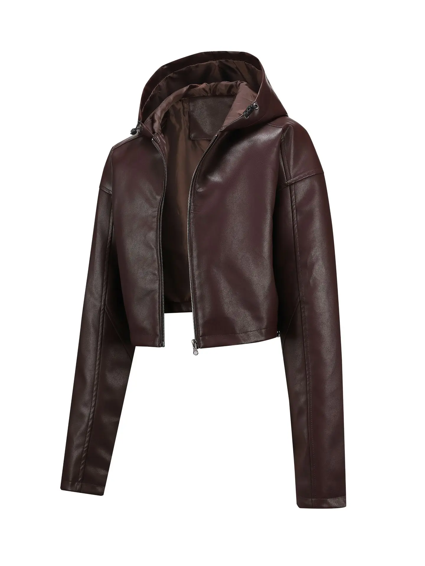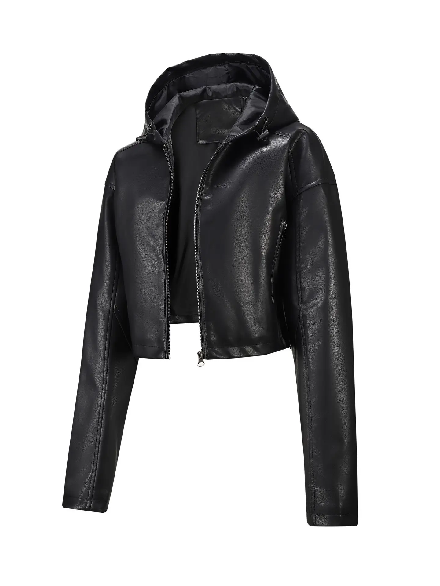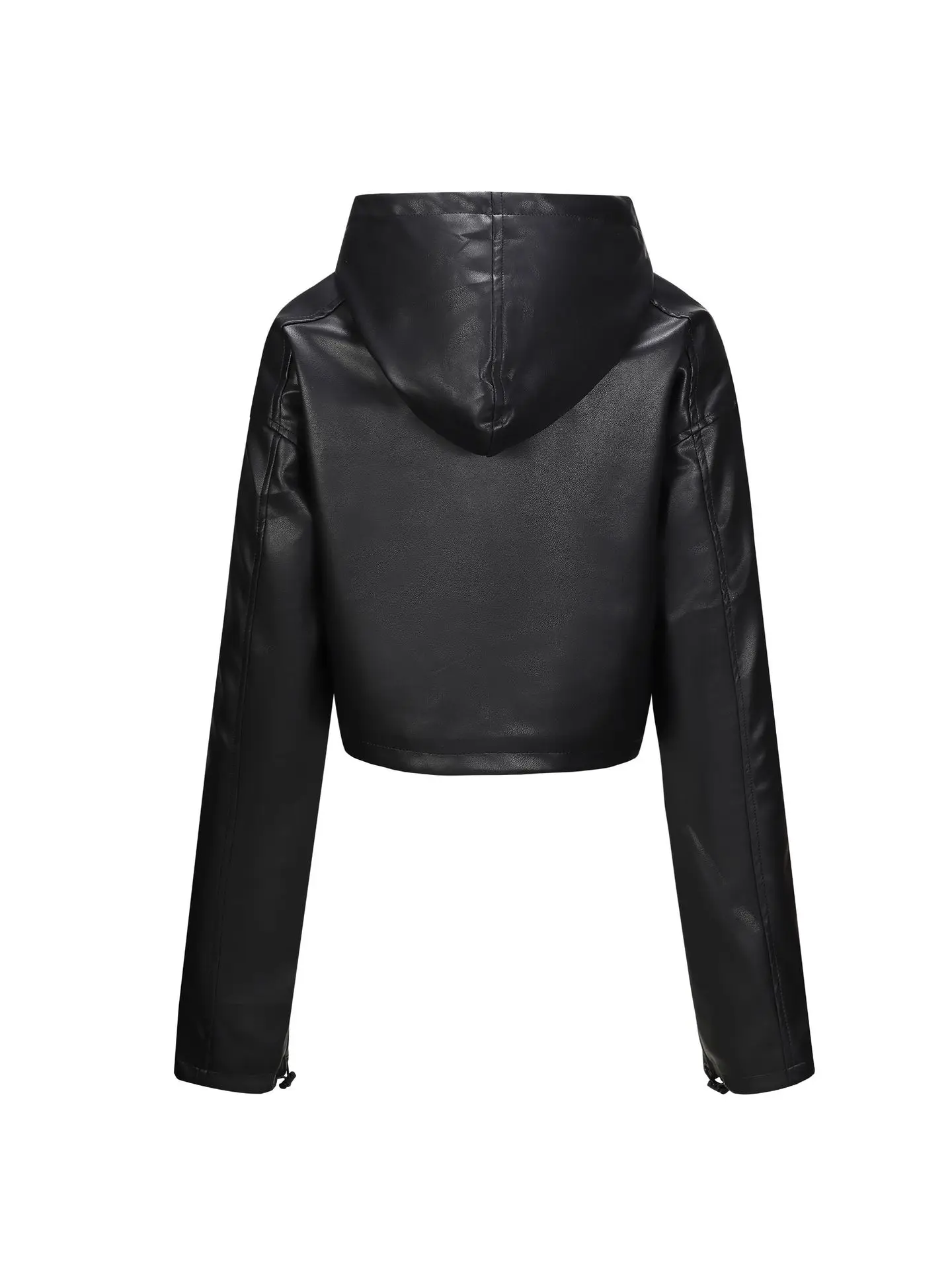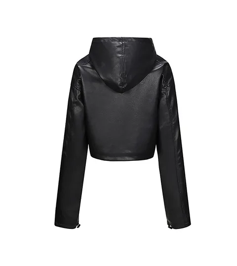 Women’s Fashion Long-Sleeved Zipper Short Crop Top Fitted Leather Jacket with Hood PU Leather Jacket for Women