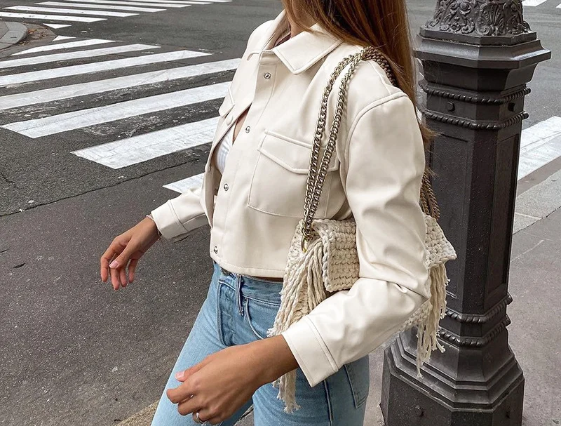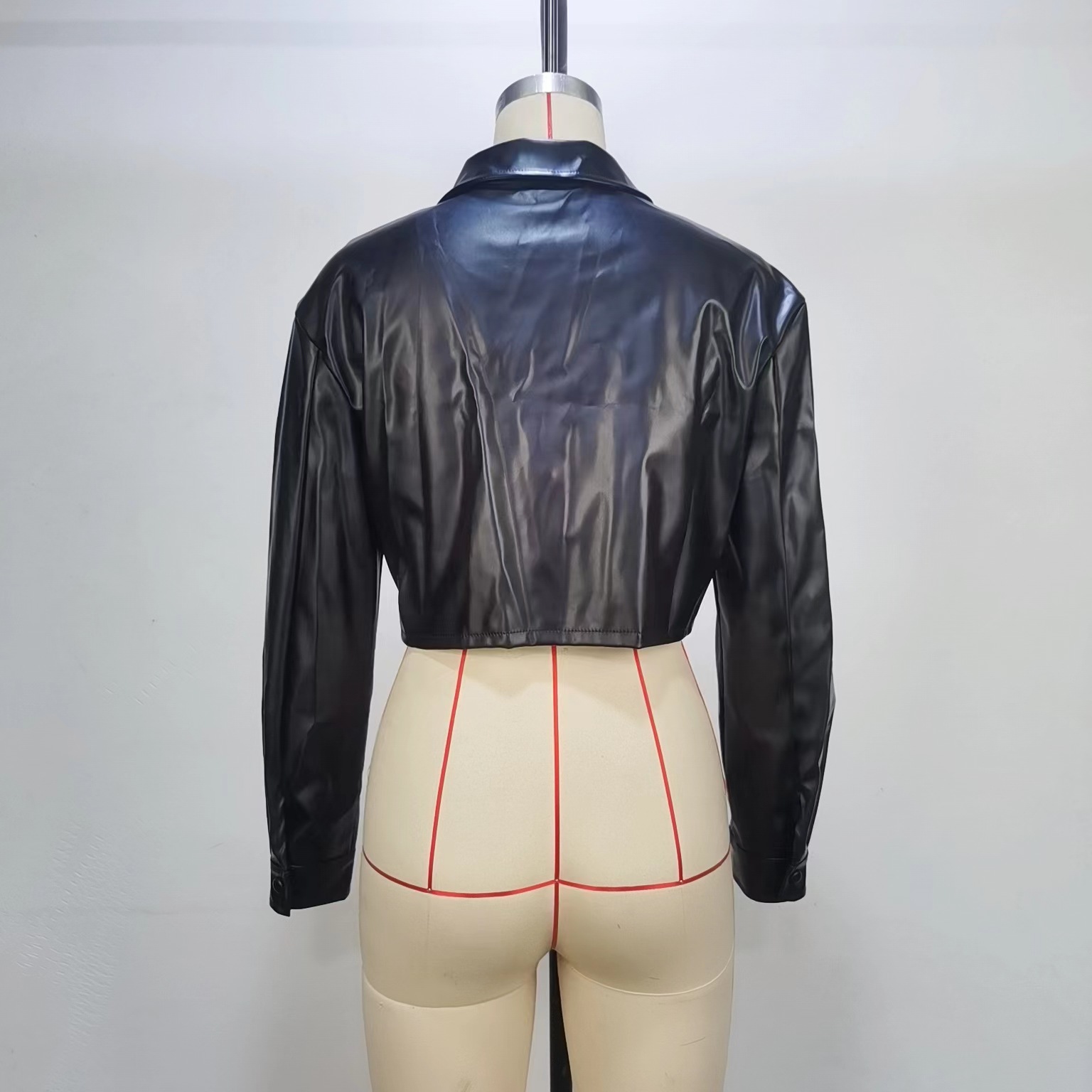 Women’s Fashion PU Leather Black Crop Jacket Autumn Casual Streetwear Button Pocket Design Polo Collar Long Sleeve Daily Jacket